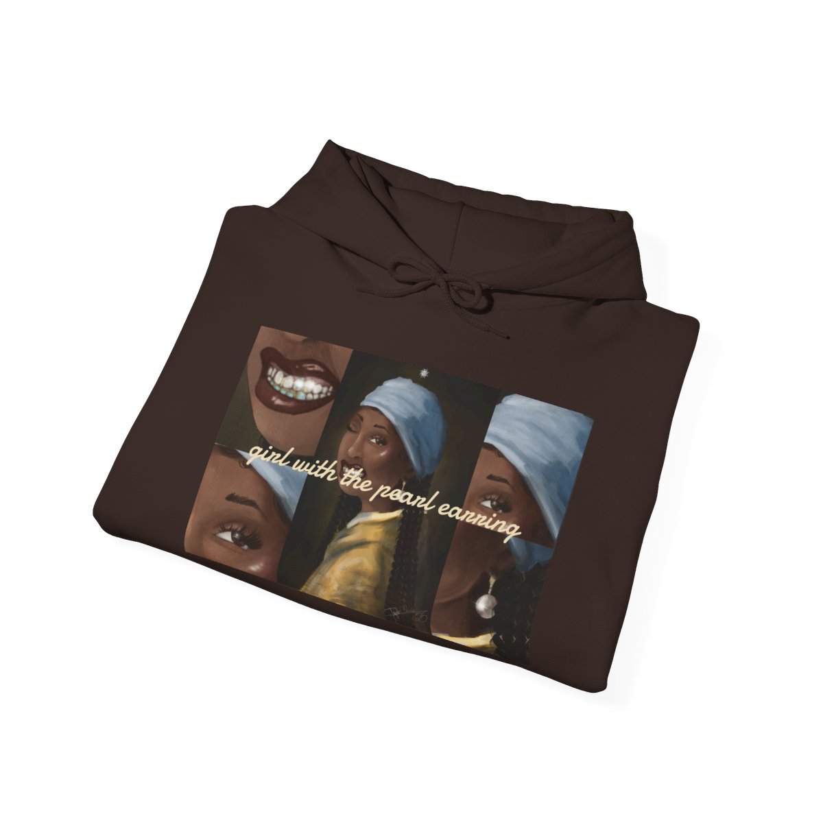 This hoodie features our resident artist, Taylor Surie's, spin on the oil painting “Girl with the Pearl Earring” by dutch Golden Age painter Johannes Vermeer dated c. 1665.The Gildan Heavy Blend™ hoodie, made from a soft cotton-poly blend, provides warmth and durability. Its unisex fit offers everyday versatility, with ribbed cuffs and hem to keep the shape intact. A large front pocket adds convenience, while the double-lined hood with matching drawcord gives it a clean, cohesive look.