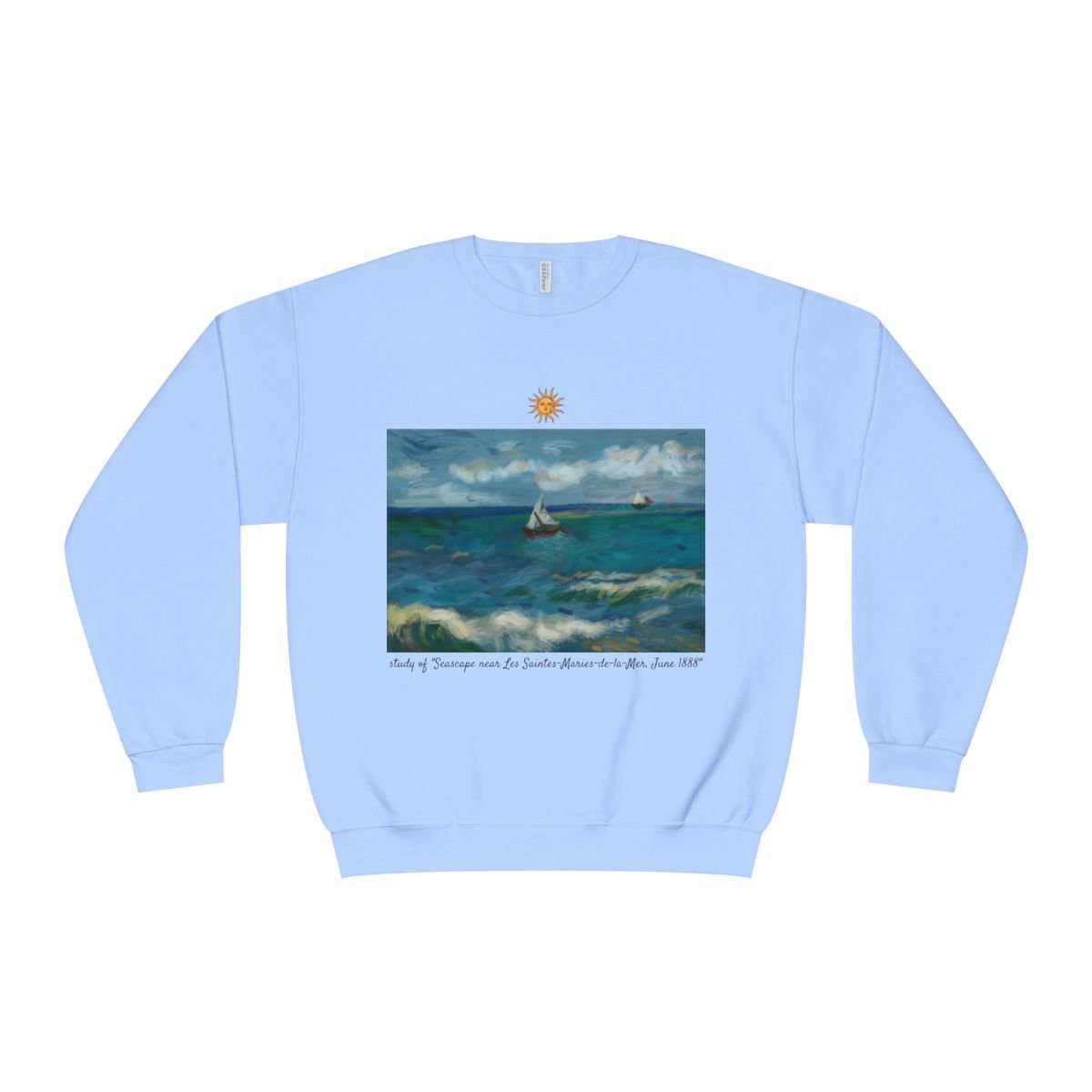 This crewneck features a digital painting study done by our resident artist, Taylor Surie, of the oil painting Seascape at Les Saintes-Maries-del-la-Mer done by Vincent Van Gogh in June 1888.